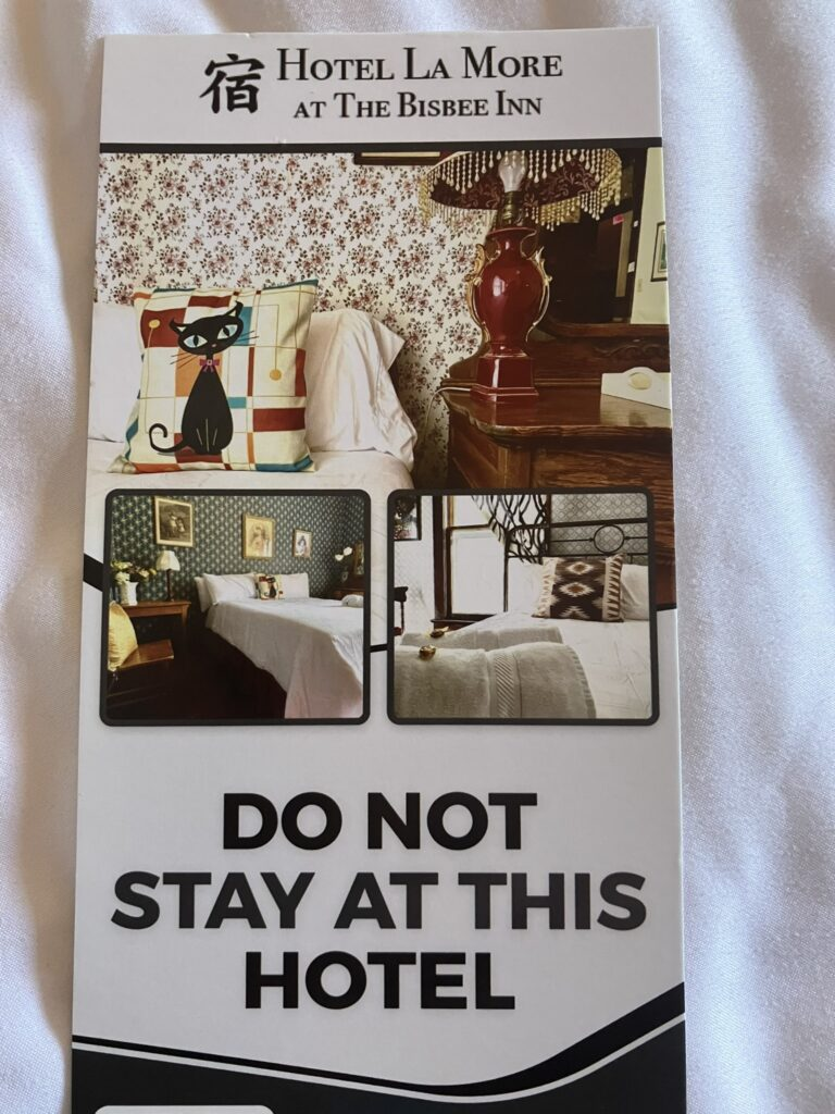 And then into the very wonderful town of Bisbee, where I spent the the night at the Bisbee Inn, also known as the La More Hotel, a hip little joint, much like the town of Bisbee itself, which is excellent. Bisbee is perhaps the best place, or certainly among the best, I’ve been on this trip, and I’ve been to some pretty good places. It may not be exactly one of a kind, but it’s close.