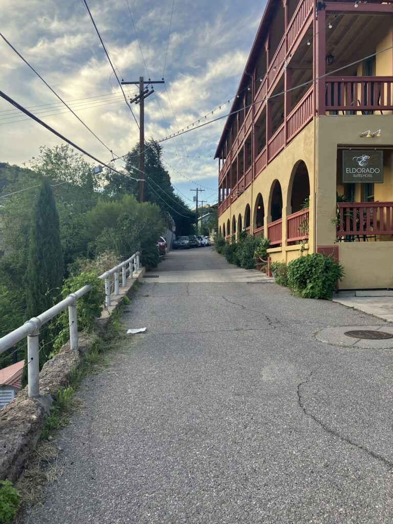 I stayed at the La More hotel, an old joint but in good shape and socially friendly. It is old, like the crappy Holly Suites Inn I stayed at in Holly, Colorado (where I found dried dog poop in my room), but unlike that place which was decrepit and in serious disrepair, the La More is well-kept, lively, social, and hip, like the town. It is on a one car-width lane (OK Road), going uphill, and parking is in town (unless you’re lucky and find a place on the narrow road), with free parking everywhere, with an uphill walk from the car to the hotel.