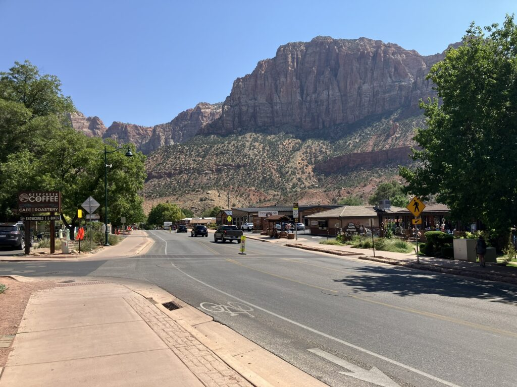 DeLynn and Maggie headed off to Oklahoma, and I headed off to Zion National Park, heading for the west gate, about 73 miles from Cedar City. I had forgotten just how nice that entrance is, as it’s preceded by Springdale, a very nice little town leading right to the entrance, with some nice stores including places to eat and drink.