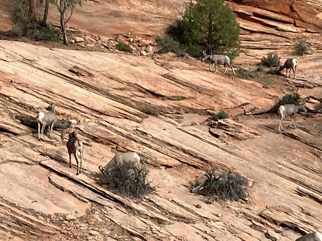 And then what did I see? The very sight Kaye had been hoping to see on our train journey from Durango to Silverton. Desert Bighorn Sheep, a small herd, just grazing on the side of the mountain, alongside the road. Wow!