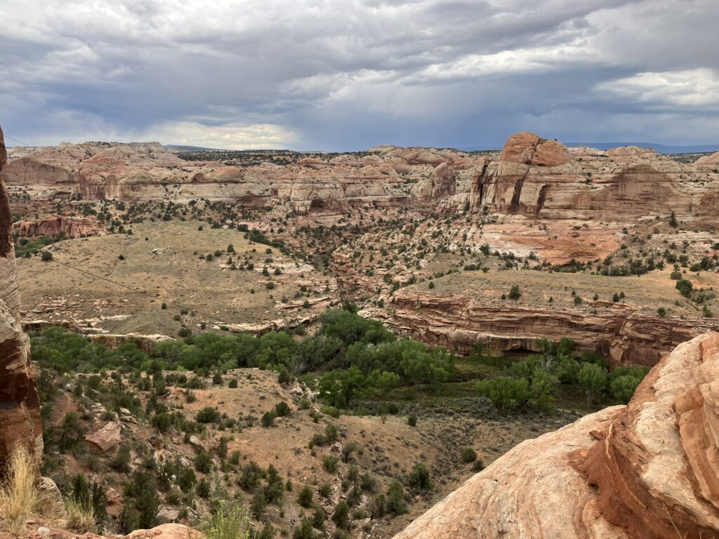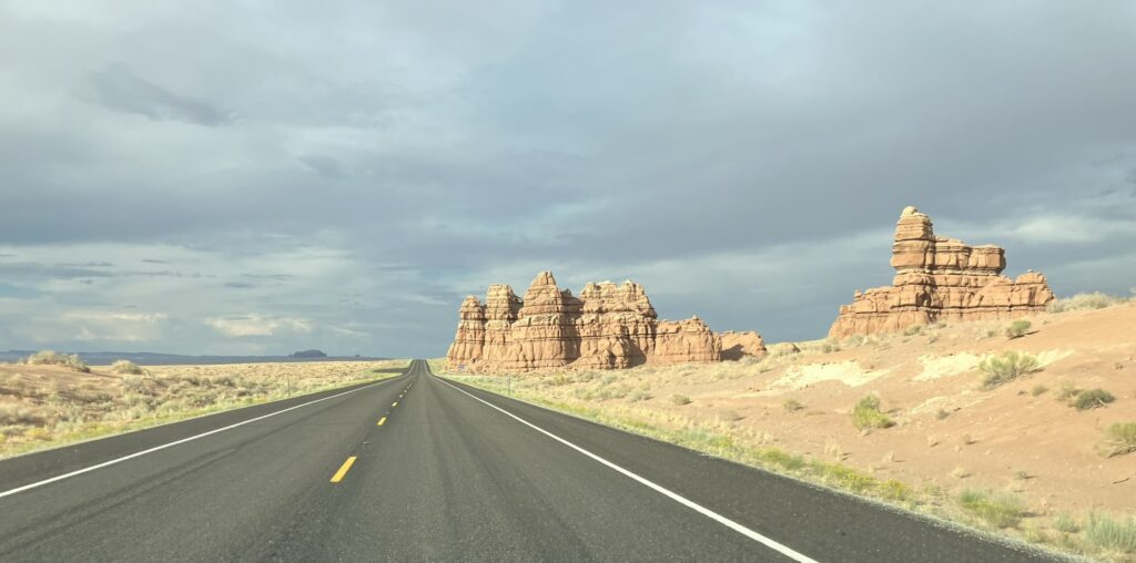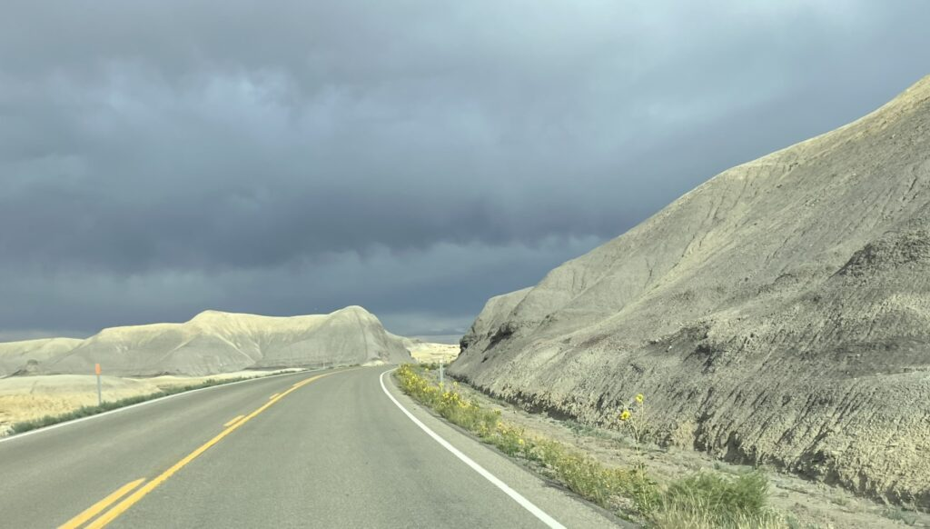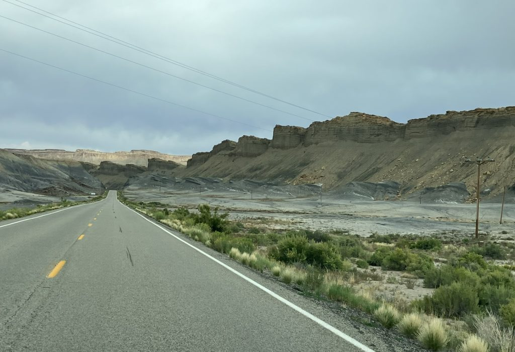 The driving was lovely at all times, and whether traveling fast, slow in the rain or when there was slower moving traffic ahead, or cautiously along the curving and twisting mountain roads, it felt leisurely, giving me plenty of time to think. I’m not sure whether I’ve traveled through the Grand Staircase before, which is vast (at 1.9 million acres, it’s slightly smaller than Delaware), but it is incredible (I’m going to wear out that word), with changing scenery, at times traveling alongside the desert and mountains, and at other times rising as high as almost 9,000 feet, looking down over vast dioramas of mountains and canyons stretching below and into the far distance.