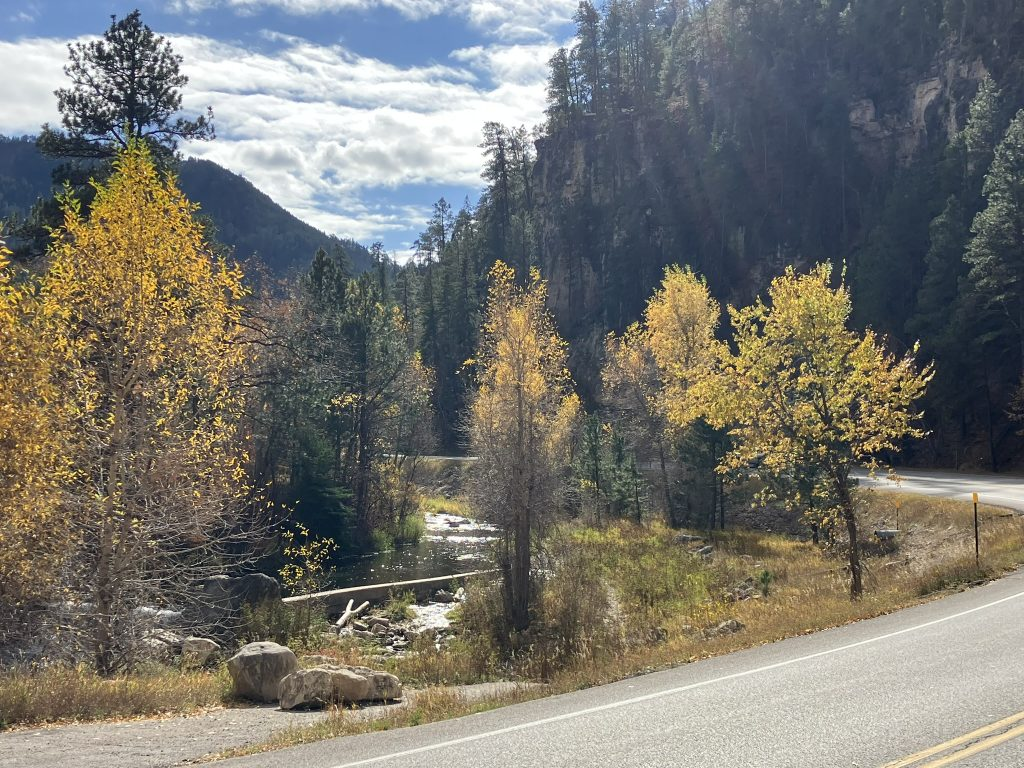 I started out by heading west again, toward Spearfish Canyon Scenic Byway, about 16 miles from Deadwood and near the town of Spearfish, named for the creek that runs through it. What a wonderful road, which I drove south for about 30 miles to Cheyenne Crossing, and colored yellow and gold with autumn foliage. Wow!