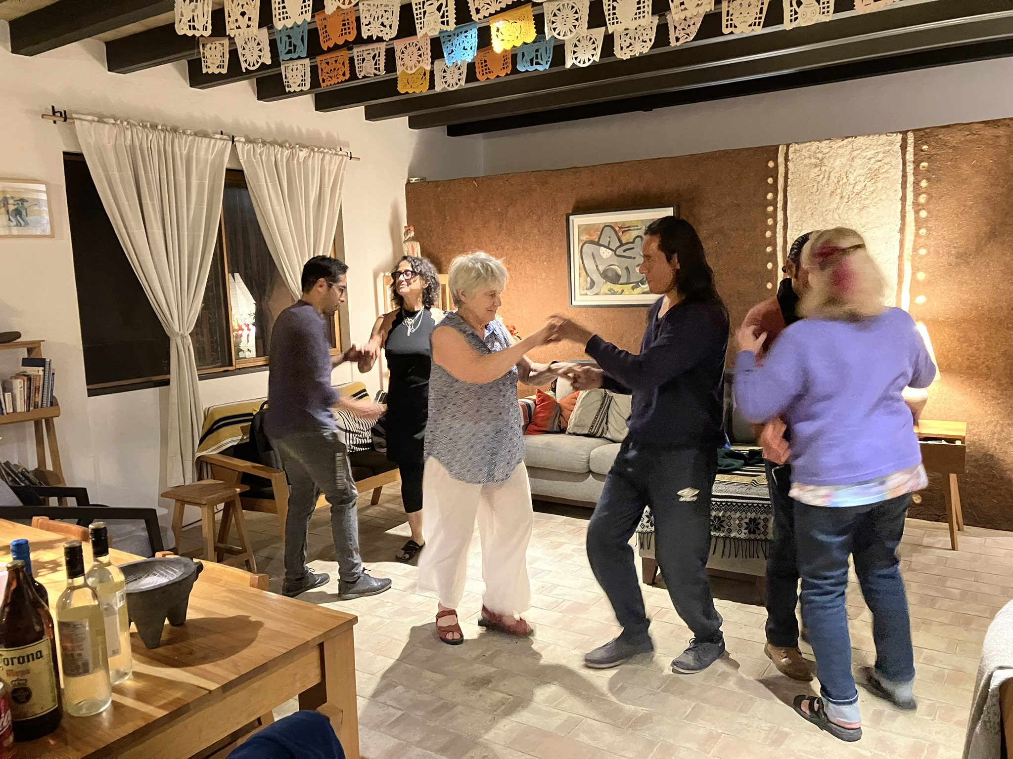 The party ended downstairs in Rachel’s apartment, with Rachel dancing with three of her local friends, Alberto, Emmanuel, and Eric (a not particularly Mexican name), who are each, it appears, expert dancers, and each of whom teach dance. Eric is a tall, indigenous guy with long hair, and quite striking. He could certainly be a model or an extra, at least, in a movie. Very striking guy, and also quiet and with a really nice disposition.