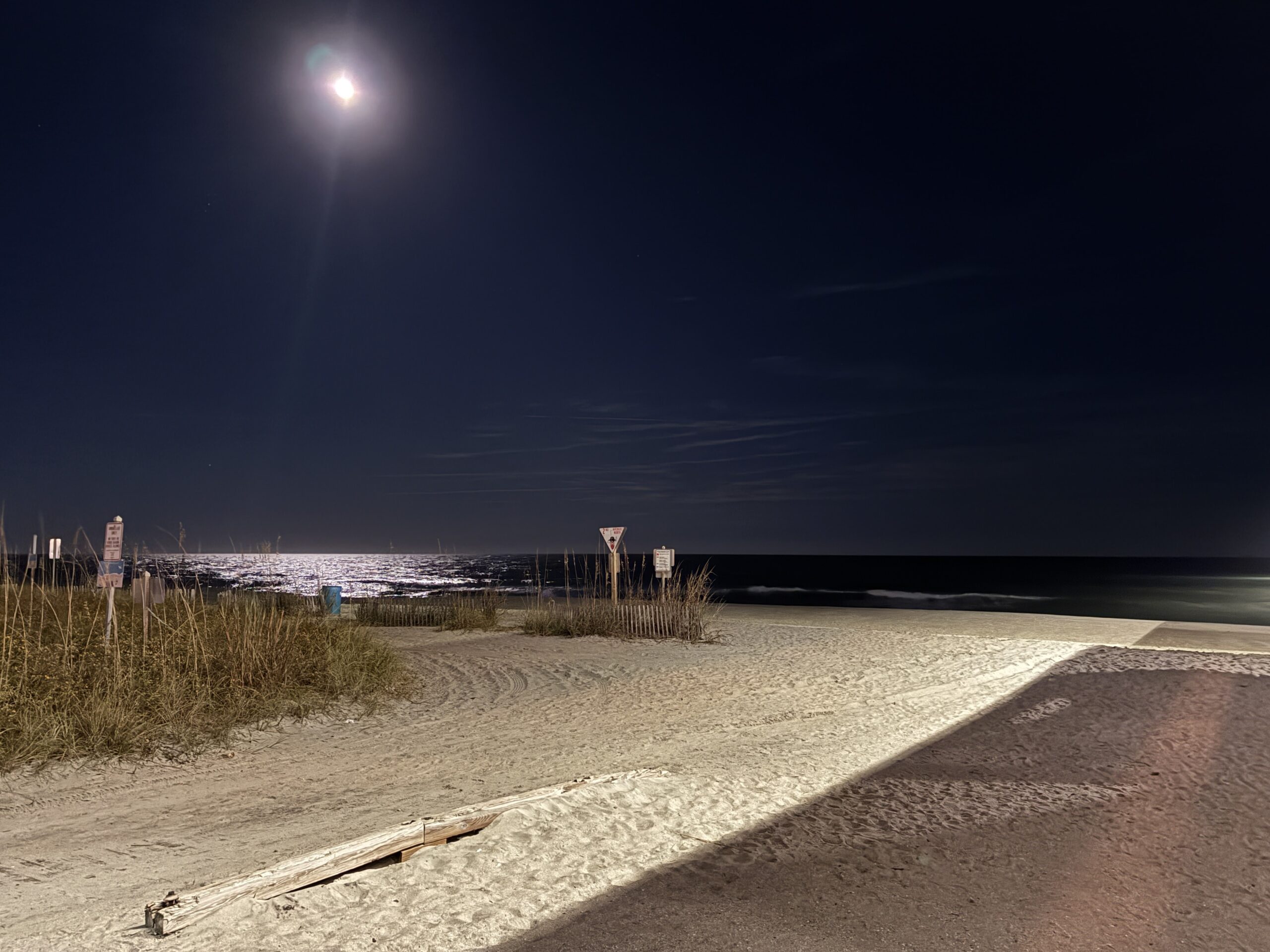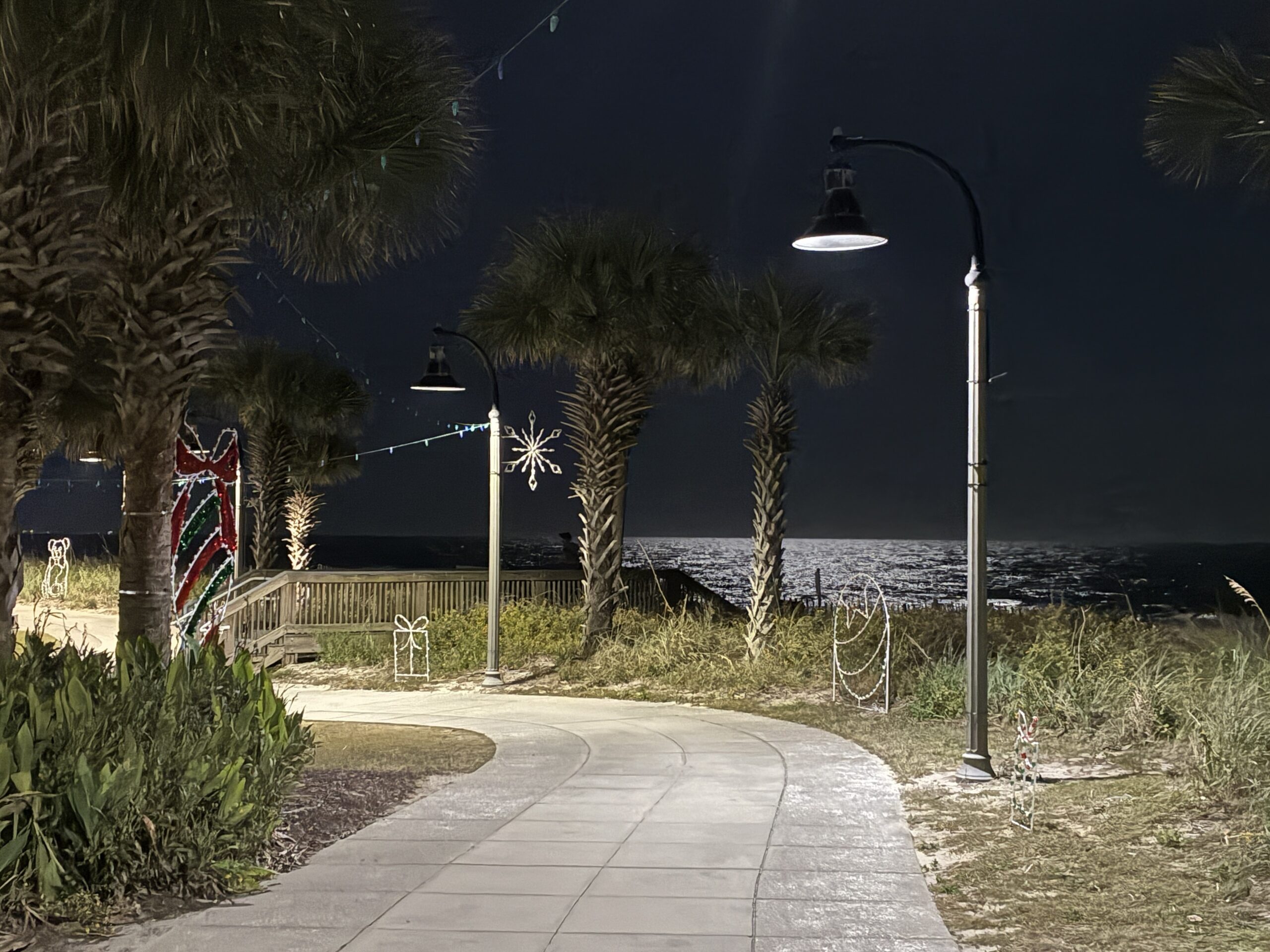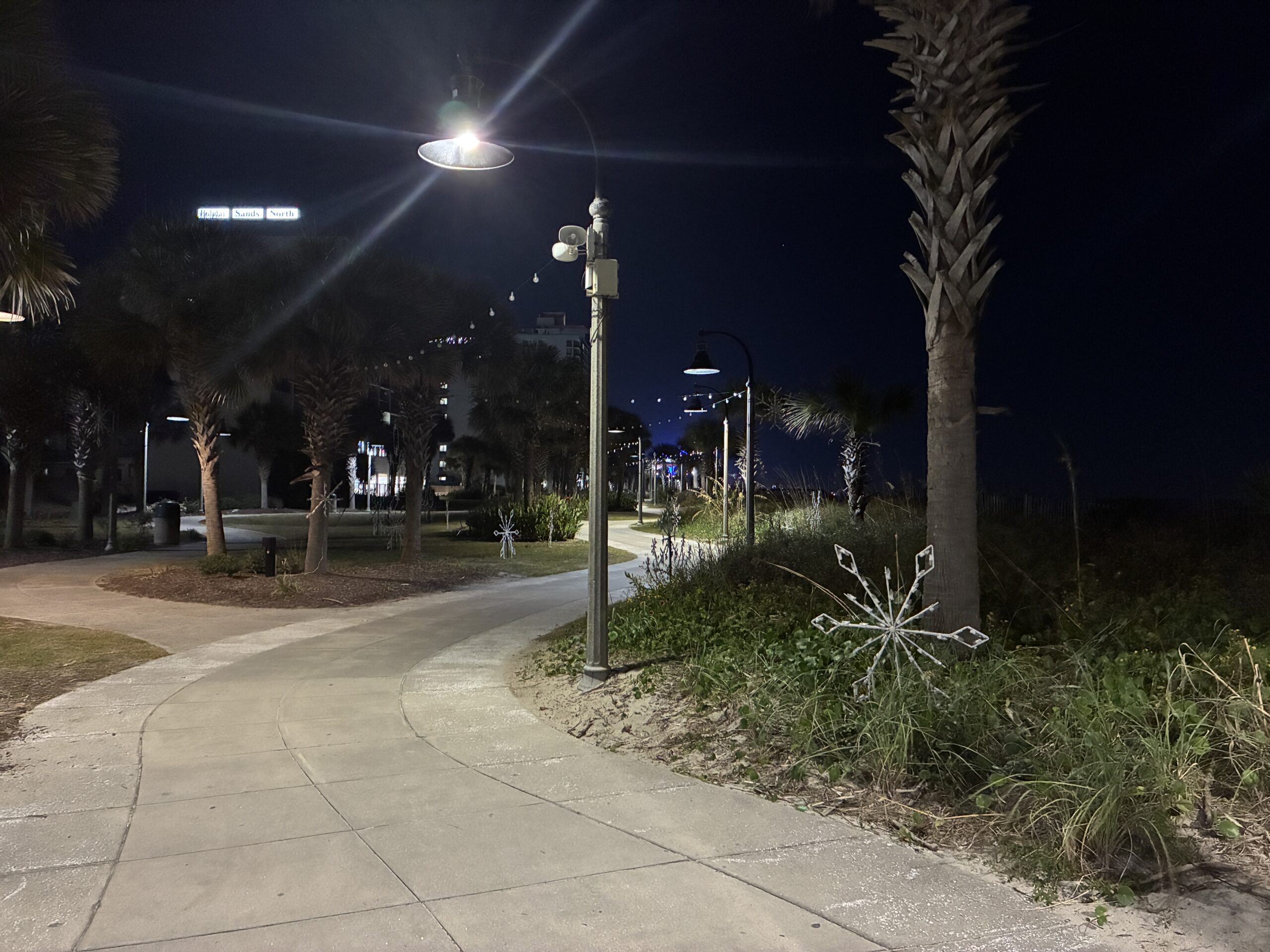 But right off of Ocean Boulevard, and running parallel to it, is the Myrtle Beach Boardwalk and Promenade, a paved and curving walk of about 1.2 miles, running between the 2nd Avenue Pier and the 14th Avenue Pier, along the ocean-facing sides of the giant hotels and condos that line South and North Ocean Boulevard (with a break for the glitzy downtown stores, restaurants, bars, and attractions that line North Ocean Blvd.). It is quiet and nicely laid out, with its unlit Christmas decorations already in place along its length (jeezs, it’s only November 5),and on one side are the giant hotels and many exits from the paved boardwalk leading to restaurants, bars, and entertainment, and on the other of the walking path the dunes and beaches of the Atlantic shore, looking serene and beautiful in the moonlight.