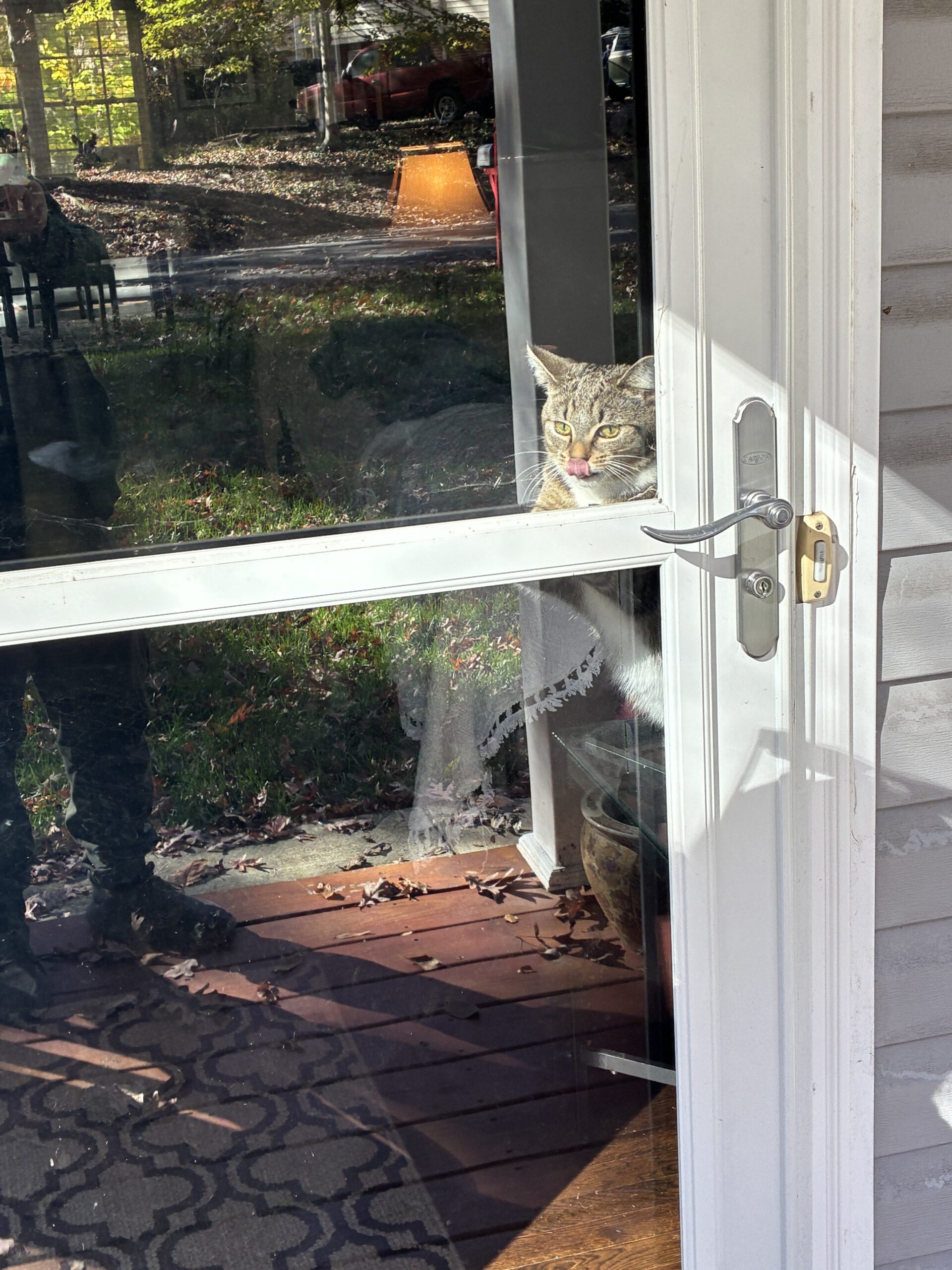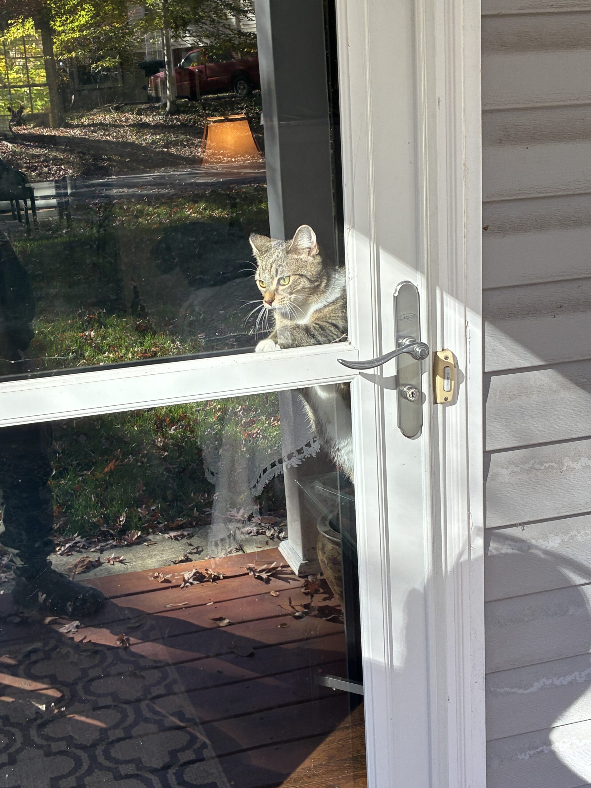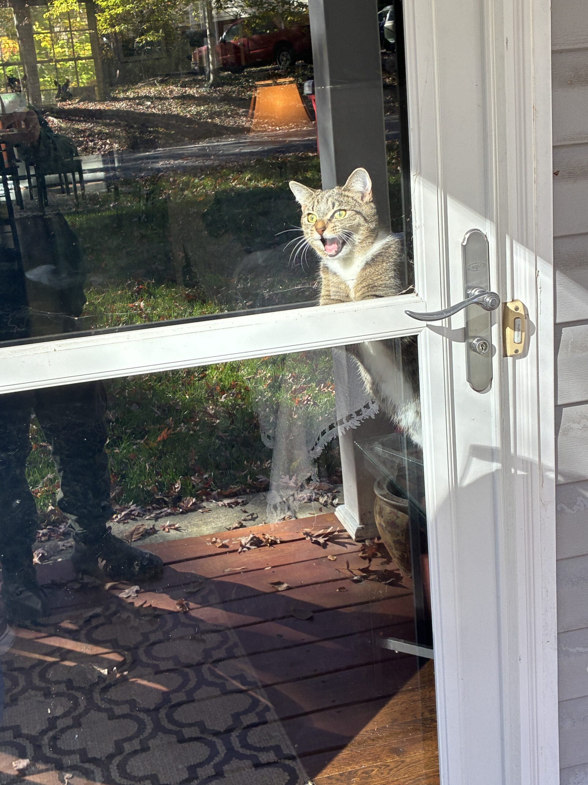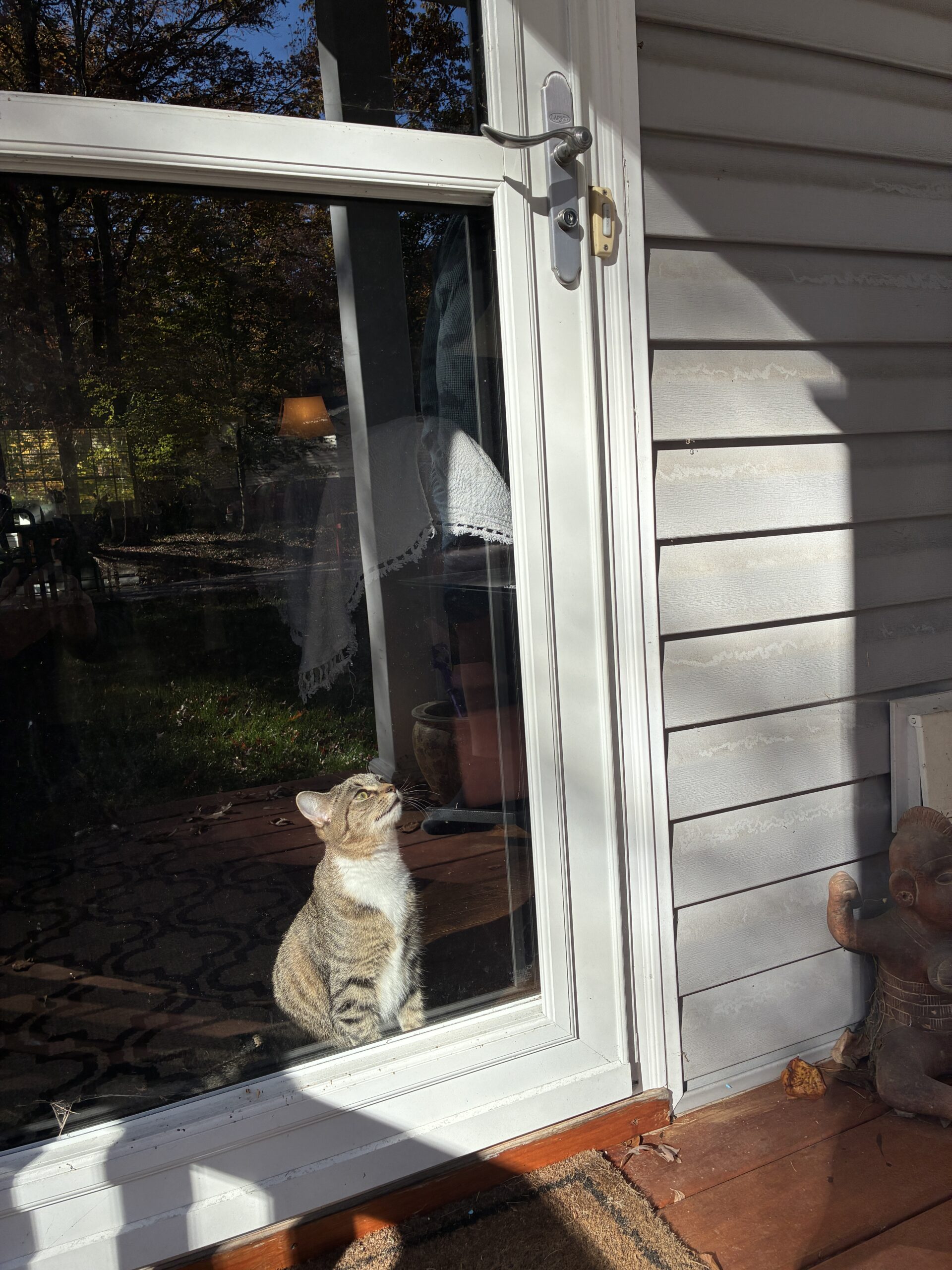 Tiger, only 8-months old and a house cat, was incensed and agitated that we were outside and she was inside, looking out the glass screen door. She made a valiant attempt to to get herself outside, but failed in the end. Still, she’s only 8-months old. She’ll learn.