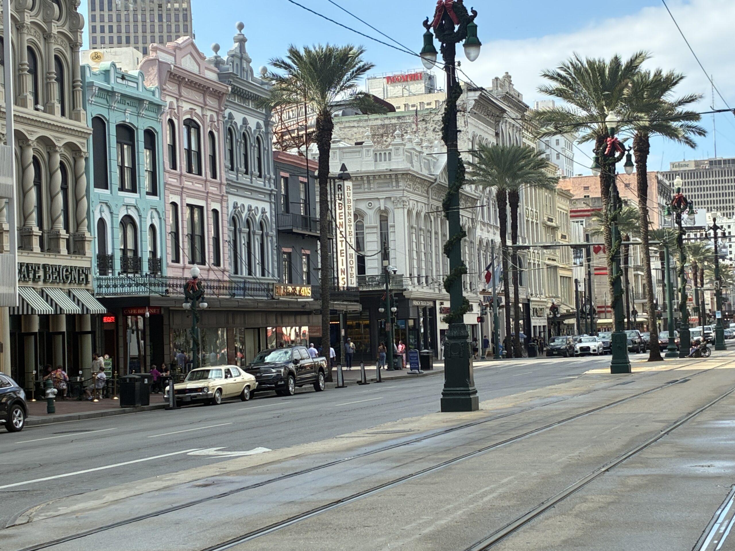 Canal Street is a large, and European looking, boulevard that marks the end of the French Quarter and the beginning of the central business district. It’s lined with stores, restaurants, bars, hotels, asnd historic buildings, with the well known New Orleans street cars running its length.